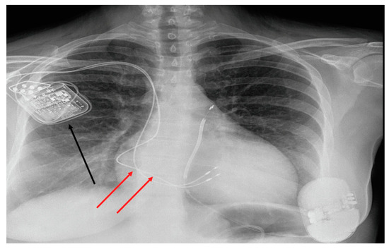 An example of the Optimizer Smart® implant in a female patient with a subcutaneous ICD. Note the presence of the impulse pocket generator (black arrow) and of two electrodes for the delivery of CCM therapy (red arrows).