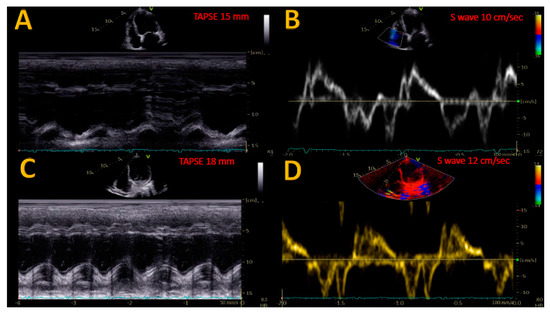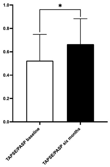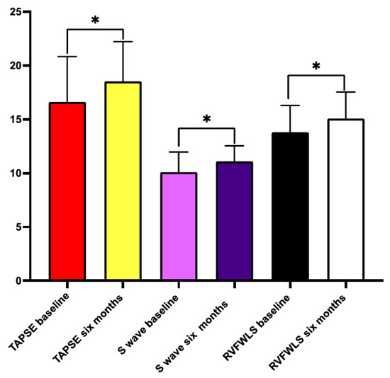 As shown in Figure 2 and Figure 3, a statistically significant increase in both TAPSE (16.6 ± 4.2 mm vs. 18.5 ± 3.6 mm; p < 0.05) and S wave (10.1 ± 1.8 cm/s vs. 11.3 ± 11.4 cm/s; p < 0.05) occurred at six months.