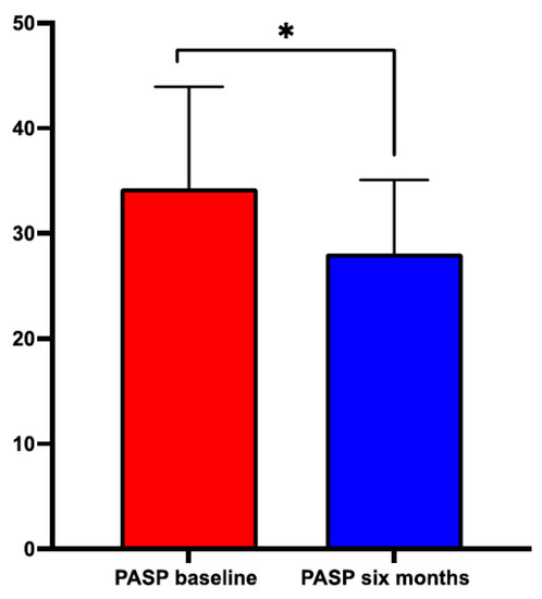 As shown in Figure 4, CCM determines, at six months, a significant reduction in PASP (34.2 ± 9.8 mmHg vs. 28 ± 6.2 mmHg; p < 0.05); also, in this case, these effects are present both in patients with normal values at baseline and in patients with a high PASP value at enrollment (p = 0.78).