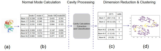 The pipeline of our data preparation. (a) A PDB file. (b) Normal Mode Calculation. (c) Cavity Processing. (d) Dimension Reduction & Clustering.