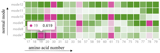 Information on the fluctuations of amino acids is given in a HeatMap (see Figure 5). The graph contains all the amino acids around the cavity, as described above, and once the amino acids around the cavity have been identified from the cavity amino acid distribution graph, the fluctuations of those amino acids in that mode be observed from the HeatMap (T1). Each grid in the HeatMap represents the displacement of the cavity-lining amino acids encoded by color. Pink means that the amino acid is present around the cavity, and green means that it is not present around the cavity, where the shade of color represents the level of fluctuation of the amino acid. The fluctuation degree is determined by using the root-mean-square fluctuation of atoms in normal mode calculation. For example, a grid with a horizontal coordinate of 19 and a vertical coordinate of mode 7 means that in mode 7, amino acid 19 appears around the cavity and the displacement is 0.691. Through this figure, we can observe the fluctuations of cavity-lining amino acids that users pay attention to in different modes, and analyze whether this atom is a direct factor affecting the cavity change. If it is not a direct factor, the user can observe the fluctuations of other atoms through the HeatMap to analyze whether there are key atoms affecting the fluctuations of cavity-lining amino acid atoms, which can be used as an indirect factor to affect the change of cavity.