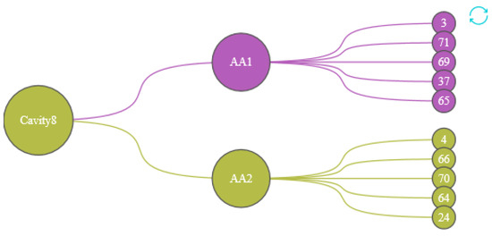 We designed the Protein Cavity Dynamics Influencing Factors View to show this, as shown in the Figure 8. The first layer of the view represents the cavity number, with the color of the node inheriting the cluster 5 (the cluster in which most of the cavity-lining amino acids are distributed); the second layer indicates the user of the cavity-lining amino acid selected in the cavity amino acid distribution map, with the color of the node representing the cluster in which that amino acid is distributed. The amino acids in the third layer are the top 5 amino acids that have a strong influence on the movement of the cavity-lining amino acids in the second layer, and the color of this node also represents the cluster in which this amino acid is distributed. By analyzing the graph as a whole, the user has a clear idea of the amino acids that affect any part of the cavity.