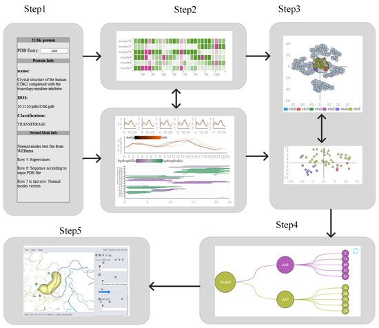 To evaluate the usability of our method, the crystal structure of CDK2 (PDB code: 2C6K [41]) was uploaded as the input structure (T6). Recent research [14] shows that the Arg 150 and Tyr 180 were recognized as key amino acids affecting the active sites. We calculate 200 normal modes of CDK2 through the WEBnm@ tool, and obtain the root-mean-square fluctuation data of amino acid atoms and the simple vibration mode vector. The cavity was calculated by using LiteMol and Caver Analyst 2.0, and the cavity sequence and cavity-lining amino acids were extracted. The normal mode is reduced and clustered by using t-SNE and K-means. The data format is shown in Figure 3. Based on this case, the following interactive analysis was carried out.
