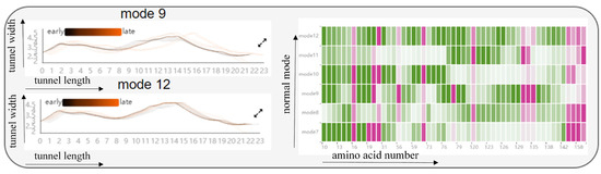 Firstly, regarding the effect of cavity-lining amino acids on the cavity, we designed the Cavity Length–Width View, the Cavity-lining Amino Acid Distribution View, and the AAF HeatMap View (see Figure 11 and Figure 12). These views show static information about the radius of the molecular cavity, the distribution of the surrounding amino acids, and the properties of the amino acids at different time slices, while it allows users to explore the fluctuations of cavity-lining amino acids at different times slices. As shown in the Figure 11, the AAF HeatMap View shows that any of the amino acids in mode 12 fluctuate strongly, and as these amino acid fluctuations are relatively consistent overall, the Cavity Length–Width View reveals that the changes in the cavity remain unremarkable. In contrast to this is mode 9, where there is a clear difference in the amino acid fluctuations, with some amino acids fluctuating strongly and others fluctuating less, and the distribution of these dramatically fluctuating amino acids is highly dispersed. Ultimately, we can see from the Cavity Length–Width View that the cavity of mode 9 is changing strongly. From these findings, we can conclude that the scattered, disordered movement of amino acids around the cavity has a greater effect on the cavity than the overall, regular movement.