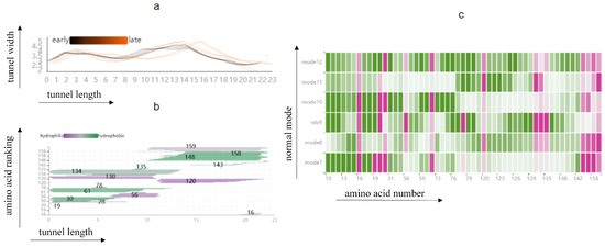 In addition, the distribution of amino acids around the cavity and their properties can be analyzed in depth using the Cavity Length–Width View, the Cavity-lining Amino Acid Distribution View, and the AAF HeatMap View (Figure 12). The Cavity Length–Width View shows a visible change in radius in the second half of the cavity in mode 9. The Cavity-lining Amino Acid Distribution View shows the amino acid numbers around the second half of the cavity, which are 158, 148, 143, 120, and 16. Finally, we find from Figure 12c that these cavity-lining amino acids fluctuate little, except for amino acid 16, which fluctuates very similarly across the six modes. Therefore, we reasonably guess that it is not only the violent fluctuation of cavity-lining amino acid 16 that affects the strong change in the lower half of the cavity, but also the fluctuation of key amino acids that may affect the fluctuation of amino acid atoms in other cavity-lining amino acids, thus affecting the change of the cavity.