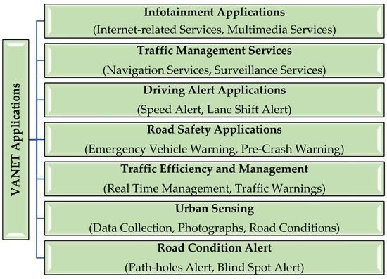 Vehicle ad hoc networks (VANET) are often referred to as networks on wheels, which are used to provide connectivity between vehicle nodes. It is an outgrowth of mobile networks. Vehicular nodes are self-organized and connect with each other in a less environmentally sound infrastructure. The IEEE Committee has established the IEEE 802.11p standard for VANETs, recognizing that the ad hoc vehicle network is essential for the provision of safety-associated applications in the Intelligent Transportation System. For short-range transmission, the US Federal Communication Commission (FFC) has allotted 75 MHz of bandwidth at 5.9 GHz between vehicle-to-vehicle (V2V) and vehicle-to-infrastructure (V2I). The main objective of VANETs is to create an intelligent framework for transport. In building V2V and V2I communications, Dedicated Short Range Communication (DSRC) may play an important role. DSRC has a range of around one thousand meters. Inter-networking via VANETs has received huge attention over the past few years. Realizing its increasing importance, academia, major automotive manufacturers, and government agencies are making efforts to develop VANETs [1,2]. VANET has mobile nodes, sensor vehicles, static networks, fixed roadside access points (RSAP), and wireless links such as V2V, V2I, and point-to-a-vehicle access (I2V). Depending on the coverage requirements, this wireless communication device consists of a combination of GPS and a cellular communication system using either one- or multi-hop mode. One of this technology’s main services is to support drivers with protection so that road injuries can be reduced. Providing protection for onboard passengers is the main service offered by this form of network. A VANET’s key requirements are high processing power, large storage space, adequate energy, and node movement estimation [3,4]. This technology facilitates a variety of applications that affect daily human life, such as infotainment, traffic management services, and security, as displayed in Figure 1. Due to their unique characteristics, several clustering schemes have been proposed for VANETs in previous years. Due to technological advancement in vehicle mobility, protocols that utilize multiple network parameters have been revealed to be highly appropriate for VANETs. The authors selected parameters such as distance, density, connection stability, velocity, and location in soft computing techniques for their review work. In addition, VANETs have received a lot of consideration in industry a0nd are predicted to be introduced in the near future, thus attaining data sharing between vehicles and organizations that enable different mobile vehicle services such as safety, traffic performance, urban detection, driver support, and vehicle user entertainment [5]. Vehicles can create intra-vehicle, V2V, V2I, and still vehicle-to-everything (V2X) transmission, in particular, in such a VANET to partially reduce the load of data traffic while meeting the maintenance requests of vehicle users nearby [6].