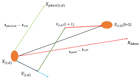 PSO is replicated by the social behavior of bird flocking. It includes a swarm of particles in search space, in which a particle captures a position and a velocity in a global search area. Figure 5 shows how a particle achieves the best optimal solution. Throughout the search time, each particle displays its own individual best named as and a global best named as . Later obtaining the , , and particle revises its velocity and position in every iteration by utilizing the following equations: