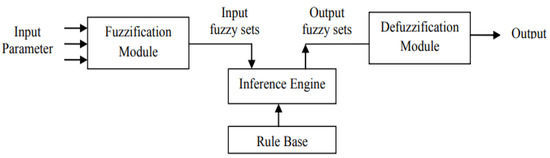Fuzzy Logic (FL) is a numerical tool developed to convey approximate human thought. FL produces intermediary standards centered on inference rules and linguistic variables, instead of a conventional set theory in which the outputs are either real or untrue. There are four fundamental components of a fuzzy logic scheme: fuzzification, defuzzification, a fuzzy rule base, and a fuzzy inference engine, as shown in Figure 6. The fuzzification component plans the device responses to the appropriate fuzzy sets. It designates every fuzzy set, which is defined by a language word, such as “high”, “low”, “moderate”, “small”, and “large” membership degree.