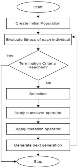 GA is an evolutionary process that replicates the mechanism of evolution in order to produce optimized solutions. Figure 7 displays the GA flowchart. According to the problem, it begins with the randomly produced population of people, called chromosomes. An individual chromosome is a set of genes containing a portion of the solution. Based on a specific issue, the fitness value is estimated. The chromosomes related to large fitness costs are chosen in the next generation for the reproduction process. In the next phase, chromosome recombination is carried out through the use of a crossover process to replicate original children. In order to produce new offspring, the crossover process combines the genetic features of two parents. A mutation procedure is executed on the chosen chromosomes to produce new children by arbitrarily altering the genes of the specific chromosomes. This process is repeated until an optimal solution is attained [38].