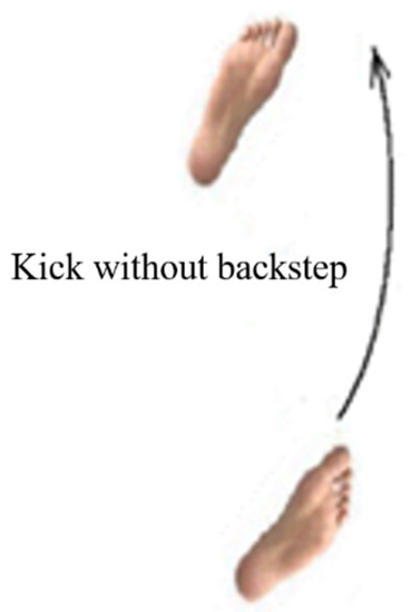 The roundhouse kick is executed by raising the kicking leg’s knee in a chambered posture, rotating the hip, and extending the knee in a snapping-forward movement to attack the opponent [9]. The kicking leg delivers the kick, while the supporting leg bears the weight of the body and allows for hip pivoting. The trunk and the supporting leg are critical for stability and countermovement to maintain kick balance during kicking [6]. Characteristic Taekwondo stances with the lower extremities forward and back along the direction of attack can be switched back and forth during a sparring match [10]. Stepping back and forth is called footwork, and it has a significant impact on roundhouse kick performance during counterattack procedures [11]. When an opponent attacks from an open stance, the defender frequently counterattacks after taking a step back. If the attacker uses a long kick, the defense should take a longer step back to counterattack. Likewise, if the opponent uses a short kick, the defender should take a shorter step back [10]. Therefore, Taekwondo athletes should control the degree of step back according to the opponent’s kick range in order to avoid giving clean hits to the opponent while also being able to execute fast roundhouse kicks as counterattacks [3].