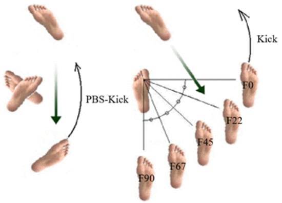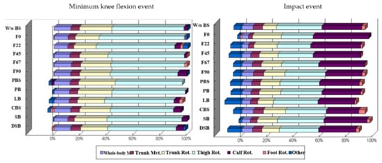 Second, in the impact event during the roundhouse kick with PBS, the contribution rate to the toe velocity was the largest from calf rotation, followed by thigh rotation, trunk rotation, and whole-body movement. In addition, the contribution rate of calf rotation in the angle-change-type footwork was higher than that of thigh rotation, except for F90. Although there was no significant difference in the velocity of calf rotation, the contribution rate decreased as the angle increased, indicating that the type with a smaller backstep angle relies on knee extension motion to kick more.