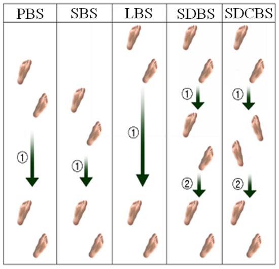 During the warm-up procedure, each participant performed the backstep movements five times. Then, the average distance of those backstep movements was calculated (PBS). The SBS distance was the average distance minus 30% of the average value; the LBS distance was the average distance plus 30% of the average value; the SDBS distance was two times that of the SBS; and the SDCBS was two times that of the SBS with the cross-backstep. Each participant’s preferred distance from the target was used.