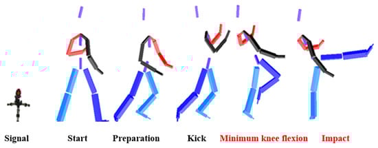 The signal, start, preparation, kick, minimum knee flexion (MKF), and impact were identified as a set of actual events to analyze data (Figure 5). The start (the start of the backstep motion) was visually determined using the movements of the right toe and heel markers. Preparation was described as the completion of the backstep and readiness to kick. The moment the kicking foot toe left the ground was defined as a kick. MKF was the moment when the kicking leg had the minimum knee flexion. The point when the marking on the target mitt began to move was considered the impact. At the MKF and impact events, the contribution of the body segments to toe velocity was calculated. For marker tracking, the best trial from each condition was chosen. Kwon3D software digitized motion capture data to find reflective markers. The reflective markers’ 3D coordinates were generated using a DLT algorithm and smoothed with an 8 Hz low-pass 4th-order Butterworth filter.