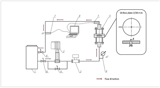 Scheme of laboratory installation 1—circulation tank, 2—pump, 3—electromagnetic flow meter, 4—manometer, 5—cavitation reactor, 6—valve, 7—piezoelectric pressure gauges, 8—computer unit.