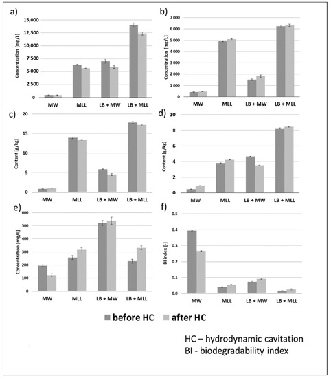 The results in terms of organic compounds are presented in Figure 3. Compared with the raw mixtures, HC resulted in minor declines in the COD content in all mixtures (Figure 3a). Major changes were observed for both mixtures with LB. Reductions of 15.7% and 11.8% were observed for LB suspended in MLL and MW, respectively. A similar observation was made for the TS content (Figure 3c). The exception was the series with MW; in this case, comparable results were achieved before and after HC. The observed changes resulted from the destruction of organic compounds that occurred within HC [9]. However, considering the VS content, there was no clear tendency in terms of the HC influence on the compositions of mixtures. In the case of MLL, as well as LB and MLL, comparable results were found before and after HC. The major change, as previously, was found for LB suspended in MW: a drop of 24% in the cavitated mixture was observed, indicating decomposition of LB.