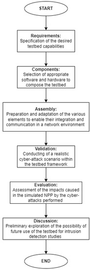 In this section, we present the requirements considered in building up the proposed testbed, and we discuss the idea that guided the validation of our design. Then, the testbed components are detailed and discussed. The followed methodological process can be seen in the flowchart depicted in Figure 1.