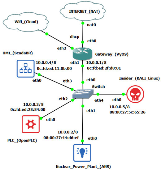 This configuration is sufficient to carry out insider attacks between the ANS and the HMI, since it is assumed that the subnet is segregated from the Internet in critical infrastructures such as NPP (Air Gap). However, the VyOS router [22] was also added and configured in the topology to allow access to the internet of the test environment and thus facilitate the installation and configuration of the programs and also allow for HIL testing (Arduino Wi-Fi). The resulting GNS3 topology is shown in Figure 8 and its IP scheme in Table 4 below.