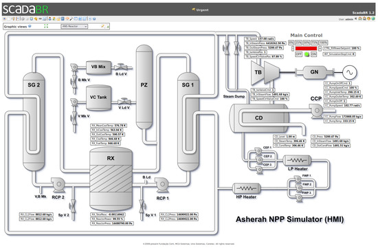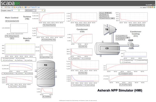 Besides the desired participation of the nuclear reactor (RX) and its reactivity control variables, our choice of subsystems of ANS to be included in the ScadaBR HMI was guided by their close relationship to those that are likely to be mostly affected in the cyber-attack scenario planned as a validation test for the proposed framework. To this end, we determined that the attack would primarily involve the condenser cooling pump (CCP). This system in the tertiary circuit is responsible for controlling the balance between steam and water in the condenser (CD) linked to the output of the power plant’s electrical generator driving turbine (TB). Its improper operation could, in the extreme, cause the interruption of the turbine (TB) operation, and indirectly of the nuclear reactor. Another feature that makes this subsystem attractive for an insider is that it is usually physically located outside the nuclear island.