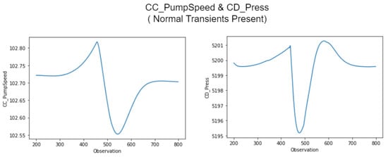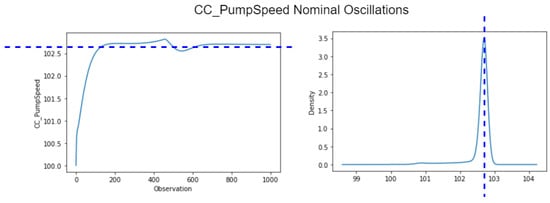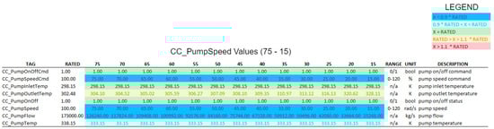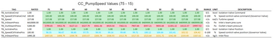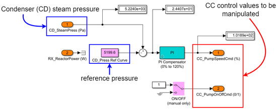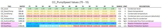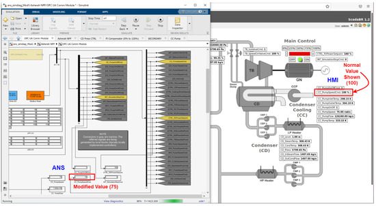 In more specific terms, the attack consisted of using the Rogue PLC to set the value of CC_PumpSpeedCmd to 75, while the HMI instead showed its normal value around 100, for main control power output of 100%. In the absence of manipulation, this variable adjusts the condenser cooling pump (CCP) speed to keep the condenser (CD) vapor pressure close to a reference value (5200 Pa), as can be seen in Figure 11.