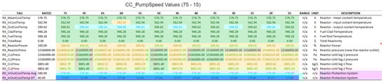 These considerations led to the development of a HMI consisting in the numerical and graphical screens shown in Figure 9 and Figure 10. In those, we have just linked the variables associated with the chosen subsystems: main control; condenser cooling (CC); condenser (CD); turbine (TB); and reactor (RX). Their characteristics are described in greater detail in the experimental section of this paper.
