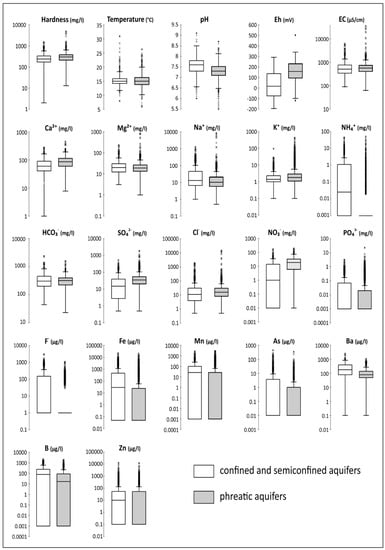 Table 1 shows the main descriptive statistics and Figure 2 the boxplots of all physic-chemical parameters and ions concentrations grouped according to the aquifer type. For completeness, the descriptive statistic of the entire database is reported in Table S1 of the Supplementary Material.