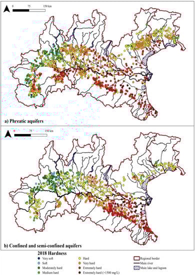 2018 Hardness distribution in the (a) phreatic, and (b) semi-confined and confined aquifers.