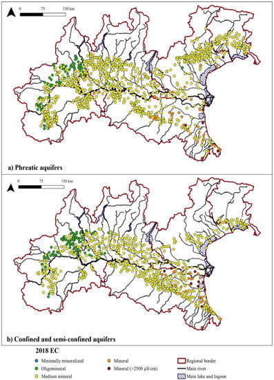 2018 EC distribution in the (a) phreatic, and (b) semi-confined and confined aquifers.