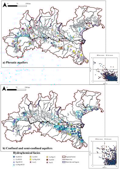 After obtaining a homogeneous database, the concentrations of major ions were used to assess the hydrochemical facies. Distributions of chemical–physical parameters, metals, and compounds of environmental interest were also analyzed and discussed in relation to the aquifer types. The aquifer type was chosen as discriminating character to assess any difference in groundwater, since it was one of the most comprehensive and homogeneous characteristics provided by all regional datasets. Data were also divided according to the sampling season (spring-summer and autumn-winter considered from now on as “warm season” and “cold season”, respectively) to assess changes over the year. Analyses were carried out on 3671 samples distributed as follows: