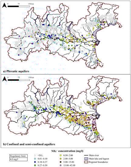 In confined aquifers, NH4+ concentrations higher than 0.5 mg/L are found downstream of the spring line (fontanili), limited to the EMR plain and the lower VEN plain (Figure 6b); in both cases the natural origin is established [85,86].