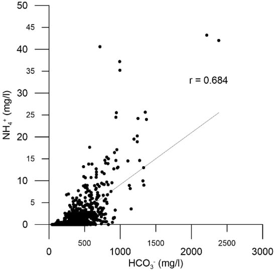 Correlation between HCO3− and NH4+ among the confined and semi-confined aquifers.
