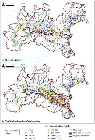 In confined and semi-confined aquifers (Figure 8b) more than 32% and 41% of samples have values higher than the Fe and Mn legal thresholds, respectively. Being the deep aquifer less affected by anthropogenic activities, these exceedances are due to natural background [90].