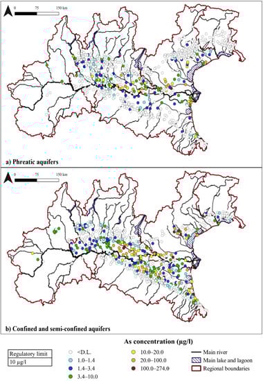 The As distribution in the aquifers of the Po Valley reflects the NH4+ distribution (Figure 6). Most of the water samples (75%) have concentrations <L.R., while the majority of values above legal threshold (10 µg/L) are localized in the semi-confined aquifers, where the effect of organic matter degradation could be greater than in deeper confined aquifers. Moreover, Carraro et al. (2015) found the main anomalies at depths between 10 m and 80 m below the ground [93].