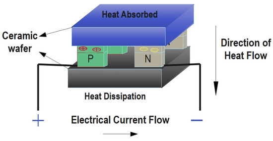 where E denotes the electric field, σ represents the conductivity of electricity, emf (electromotive force) in another meaning represents the Seebeck effect, and ΔV denotes a voltage difference. Heat dissipation or absorption processes at the junction of p- and n-type materials are described by the Peltier effect [19,20]. When the Peltier model absorbs heat, it generates electricity. When it dissipates heat, it consumes power.