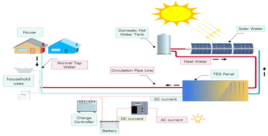A TEG panel was created by connecting TEG modules in series and parallel. This study’s goal is to transform waste heat from hot water pipes through which solar-heated water flows into useful power, as shown in Figure 2. An electric voltage can be obtained to charge a battery using a TEG panel when a temperature differential is applied to its surfaces. An inverter can convert the battery’s DC voltage into AC to power low-power devices such as CCTV recording devices or internet routers in homes. During the night, the TEG can supply electricity, since the water is usually stored in tanks for the purpose of using it in the evening. Certainly, this will lower household electricity bills.