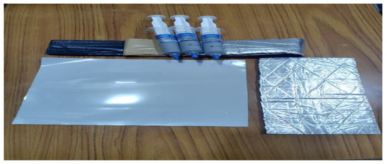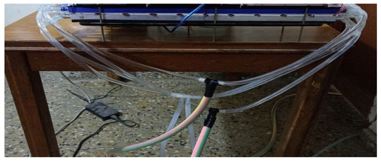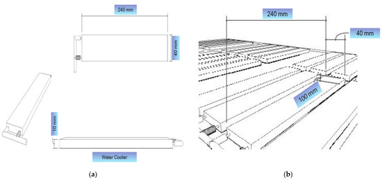 The processing system consists of three Sections. Section 1 represents the hot surface of the system, where 30 pieces of an aluminum heating block are used. The dimensions of each piece are (40 × 240 × 10 mm) [26], with an identical cooling block on the opposite side of the panel. This was built as shown in Figure 4. Then the hot water coming from a solar water heater passes these pieces in parallel flow, with a constant velocity (0.8 m/s), to ensure a constant flow rate of water evenly entering the heating block, as shown in Figure 5. Then, this water goes into the house for domestic purposes after it heats the upper surface of the panel.