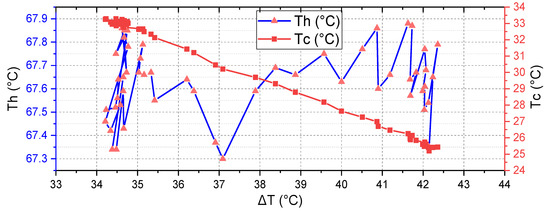 A TEG module relies on the temperature difference between its surfaces to generate electric power using the Seebeck effect. In the proposed system, two methods are used to provide this temperature difference, depending on the renewable energy source. The first method, directs the passage of normal tap water through the TEG panel, as this water performs the task of dissipating heat on the surface of the cold panel. This is usually at a temperature ranging from 25 to 34 °C. The other way is by flowing this same water after it leaves the panel to the solar water heater, and then the water is used to heat the hot surface of the TEG. After that, the water is used for domestic purposes. In this way, a temperature differential is formed, and thus electrical energy can be generated by the panel. The proposed TEG panel was tested experimentally on a July day in Iraq. The hot () and cold side temperatures ( are given in Figure 9.
