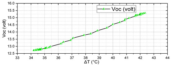 Figure 10 depicts the experimentally measured electric voltages. With a decrease in ΔT, the voltage fell dramatically. The average voltage for the 15 × 10 TEG panel was 13.73 V, with the greatest and lowest voltages of 15.3 V and 12.51 V, respectively.