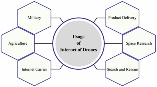 The use of unmanned aerial vehicles (UAVs), also termed drones, is anticipated to incline at exceptional rates because of growing curiosity from investors, hobbyists, and researchers; the quantity of drones is quickly rising, and the Internet of Drones (IoD) environment and number of related applications are expanding rapidly, in which an infinite number of multi-sized drones flawlessly communicate with one another via area service providers whose objective it is to understand and align the accessibility of drones to a controlled airspace and operate a navigation service [1]. The economic development of drone industries in the United States, involving military scouting, traffic, wildlife surveillance, urban safety scrutiny of infrastructure, on-demand package supply, aerial photography, etc., is reported to be substantial for industries or business operations [2,3]. Figure 1 depicts the procedure of IoD.