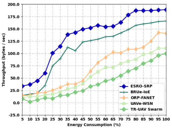 In this section, the performance validation of the ESRO-SRP model is examined under distinct levels of energy consumption (EC). The EC is varied from 5% to 100% with a step size of 5%. Table 1 and Figure 2 report a comparative throughput (THRP) inspection of the ESRO-SRP model with recent models under distinct levels of energy [22,23,24,25]. The results portrayed that the ESRO-SRP model has accomplished maximum values of THRP under all energy levels. For instance, with an EC of 5%, the ESRO-SRP model has provided an increased THRP of 33.95 bytes/s, whereas the BRUe-IoE, ORP-FANET, UAVe-WSN, and TR-UAV Swarm models have accomplished a reduced THRP of 14.54 bytes/s, 14.54 bytes/s, 9.69 bytes/s, and 7.75 bytes/s, respectively. Moreover, with an EC of 100%, the ESRO-SRP system has offered a maximal THRP of 189.20 bytes/s, whereas the BRUe-IoE, ORP-FANET, UAVe-WSN, and TR-UAV Swarm techniques have accomplished a lower THRP of 165.91 bytes/s, 140.68 bytes/s, 110.60 bytes/s, and 99.93 bytes/s, respectively.