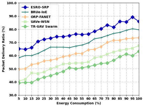 Table 2 and Figure 3 define a comparative PDR examination of the ESRO-SRP approach with recent models under distinct levels of energy. The results exposed that the ESRO-SRP model has accomplished maximal values of PDR under all energy levels. For example, with an EC of 5%, the ESRO-SRP model has provided an increased PDR of 65.20%, whereas the BRUe-IoE, ORP-FANET, UAVe-WSN, and TR-UAV Swarm systems have accomplished a decreased PDR of 58.40%, 49.60%, 40.80%, and 39.20%, respectively. Additionally, with an EC of 100%, the ESRO-SRP model has provided an increased PDR of 86%, whereas the BRUe-IoE, ORP-FANET, UAVe-WSN, and TR-UAV Swarm approaches have accomplished a minimal PDR of 79.60%, 73.60%, 67.60%, and 63.20%, respectively.