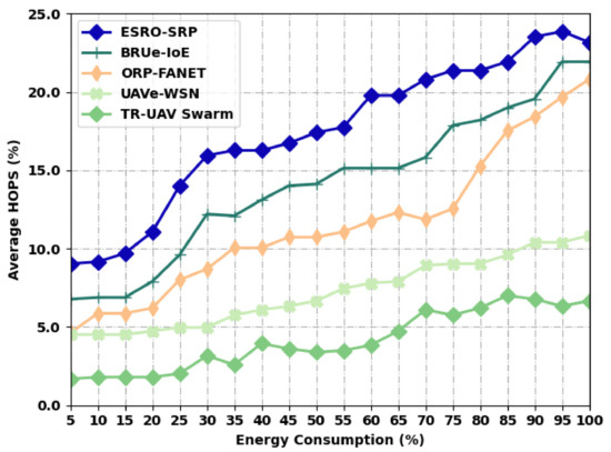 Table 3 and Figure 4 demonstrate a comparative average HOPS (AHOPS) analysis of the ESRO-SRP system with recent models under distinct levels of energy. The results depicted that the ESRO-SRP approach has accomplished higher AHOPS values under all energy levels. For instance, with an EC of 5%, the ESRO-SRP model has provided an increased AHOPS of 9%, whereas the BRUe-IoE, ORP-FANET, UAVe-WSN, and TR-UAV Swarm algorithms have accomplished a minimal AHOPS of 7%, 5%, 5%, and 2%, respectively. Finally, with an EC of 100%, the ESRO-SRP model has offered superior AHOPS of 23%, whereas the BRUe-IoE, ORP-FANET, UAVe-WSN, and TR-UAV Swarm methodologies have accomplished a lower AHOPS of 22%, 21%, 11%, and 7% correspondingly.