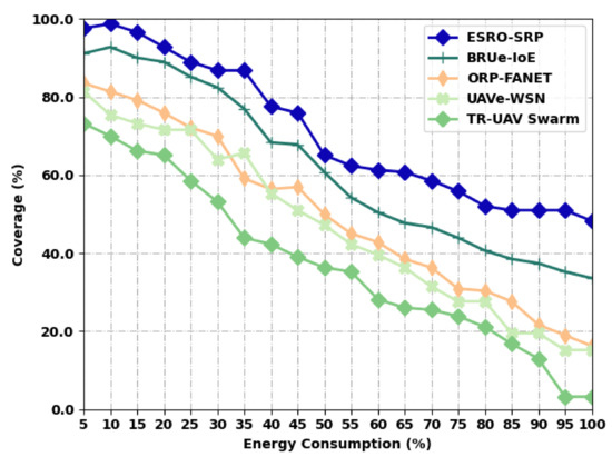 Table 4 and Figure 5 illustrate a comparative coverage inspection of the ESRO-SRP approach with recent models under distinct levels of energy. The outcomes represented that the ESRO-SRP model has accomplished improved values of coverage under all energy levels. For instance, with an EC of 5%, the ESRO-SRP model has provided a maximal coverage of 97.69%, whereas the BRUe-IoE, ORP-FANET, UAVe-WSN, and TR-UAV Swarm methods have accomplished a decreased coverage of 91.18%, 83.58%, 81.41%, and 73.26%, respectively. Finally, with an EC of 100%, the ESRO-SRP model has provided an enhanced coverage of 48.29%, whereas the BRUe-IoE, ORP-FANET, UAVe-WSN, and TR-UAV Swarm models have accomplished minimal coverage of 33.63%, 16.26%, 15.18%, and 3.24%, respectively.