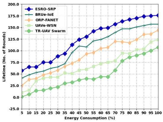 Table 5 and Figure 6 depict a comparative lifetime analysis of the ESRO-SRP algorithm with recent methodologies under distinct levels of energy. The results outperformed in that the ESRO-SRP model has accomplished maximum values of a lifetime under all energy levels. For instance, with an EC of 5, the ESRO-SRP system has provided a higher lifetime of 57 rounds, whereas the BRUe-IoE, ORP-FANET, UAVe-WSN, and TR-UAV Swarm algorithms have accomplished a minimal lifetime of 41, 25, 10, and 1 round, respectively. Moreover, with an EC of 100, the ESRO-SRP model has an obtainable increased lifetime of 176 rounds, whereas the BRUe-IoE, ORP-FANET, UAVe-WSN, and TR-UAV Swarm approaches have accomplished a decreased lifetime of 157, 144, 124, and 107 rounds, respectively.