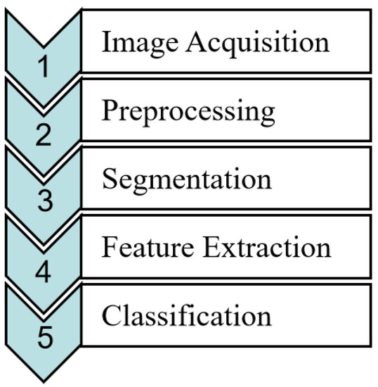With the rapid development of artificial intelligence technology, different techniques are based on artificial vision for digital image processing and the implementation of the image classification model. Reference [22] proposed methodology that consists of five stages, as shown in Figure 1, i.e., image acquisition, preprocessing, segmentation, feature extraction, and classification, to find the damages caused by the cogollero worm in corn fields.