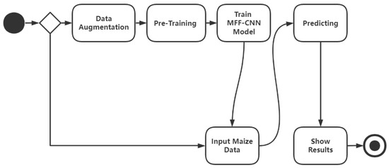 The design framework is divided into the following stages, as shown in the activity diagram in Figure 4. First, obtain the image dataset of maize leaf disease in Kaggle and enhance the data. Secondly, load the relevant model parameters for pre-training. Thirdly, the MFF-CNN model is obtained through multiple training. Then input the maize leaf data to test the disease area, and, finally, receive the maize leaf disease detection results.