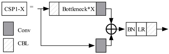 The MFF-CNN uses two different CSP structures. The CSP1-X with residual components (X bottlenecks) in the backbone is shown in Figure 6, while the neck uses convolutional layers (X CBLs) instead of residual components, shown as CSP2-X in Figure 7. The cross-layer design of the CSP reduces computation, improves inference speed, reduces memory cost, and guarantees accuracy.