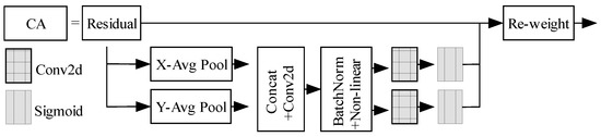In Figure 8, the coordinate information is embedded into the CA module through the X average pool and the Y average pool. Global pooling is often used for global encoding as it compresses global spatial information into channel descriptors, and it is difficult to preserve location information. To capture more precise location information, the CA module converts the global pooling into a one-to-one feature encoding operation as established by Equation (6):
