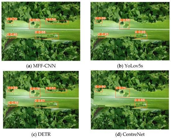 As can be seen in Figure 11, the diseased areas of the maize leaves were sparsely distributed, mainly concentrated in the upper right part and the lower left part of the leaves, and there was a certain distance between the two diseased areas. DETR and CenterNet mainly detected disease in the upper right part of the leaf, and there were a large number of missed detections. Although the transformer used in DETR focuses more on local key information, the transformer model often requires a large amount of data and a long training period to make the model converge. While the maize leaf dataset uses data enhancement technology to mitigate the over-fitting, the dataset for this experiment is much less massive than ImageNet, resulting in not fully meeting the data volume requirements of the transformer model. This is the main reason why DETR has a large number of missed detections in the lower left part of the leaf, as well as the leaf edges. Although YoLov5s detects most of the diseases, the detection confidence is lower than that of the MFF-CNN, and the detection effect is not satisfactory in the case of sparse disease distribution.
