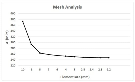 A mesh analysis was performed over the chosen stem by varying the element size in a 0.1 mm ratio, as previously reported [2,28], until the variation in the obtained results was minimum and stable; see Figure 3. Then, the mesh size was selected, and its results were compared to those published by [29].